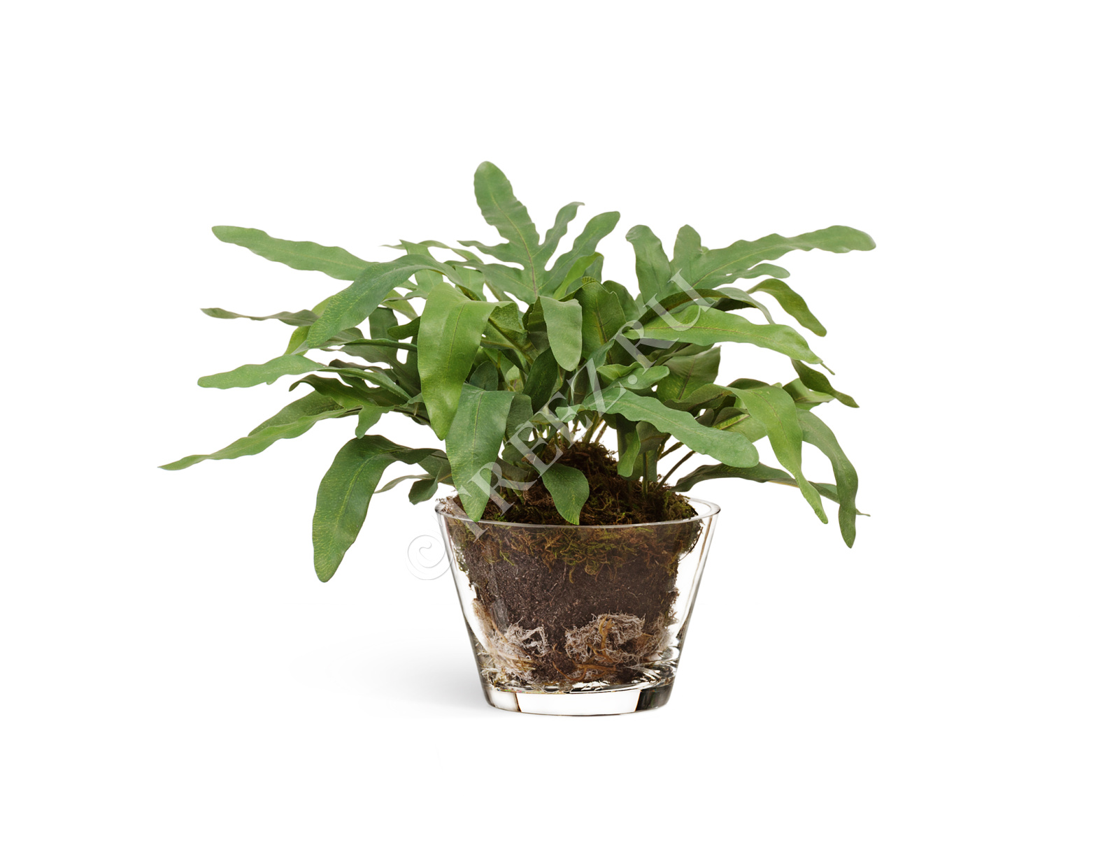 "Rabbit Foot" в стеклянной вазе с мхом, корнями, землёй