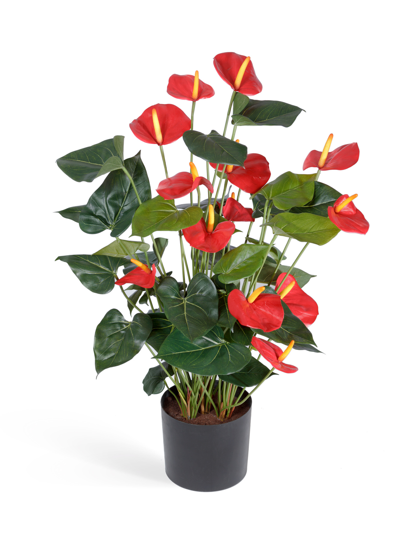 Цветущий куст Антуриума - отличное решение, если Вам необходимо что-то необычное, яркое, но не большое. Растение имеет интересные большие экзотические цветы. Это позволит Вам создать цветовой акцент в помещении, цветы имеют красивый красный цвет, который отлично смотрится сам по себе или его можно сочетаеть с розовым антуриумом. Оно поможет Вам придать интерьеру необычность, придаст яркости. Вы можете его разместить как в отдельное кашпо, так и группой в длинное кашпо. Хорошо сочетается с разными деревьями, отлично дополнит Ваш интерьер. Качество растения позволит Вам поместить его в любом месте, даже в непосредственной близости от глаз.